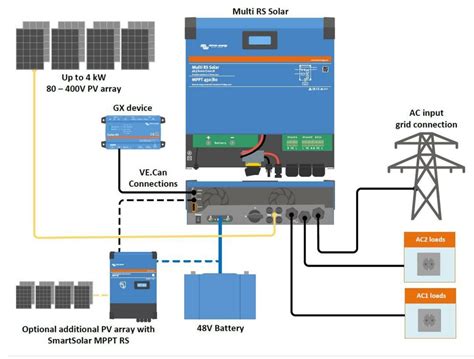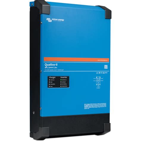 The Quattro 48 V inverter/charger accepts a 48 V DC input and produces a true sine-wave AC output at 230 VAC. It supports two AC inputs (such as grid and generator) with a built-in transfer switch and “no-break” switching under 20 ms.